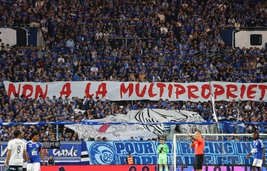 Preuve de cela, les strasbourgeois qui ne sont pas heureux de la copropriété par BlueCo de leur club (voir la banderole ci-dessous).