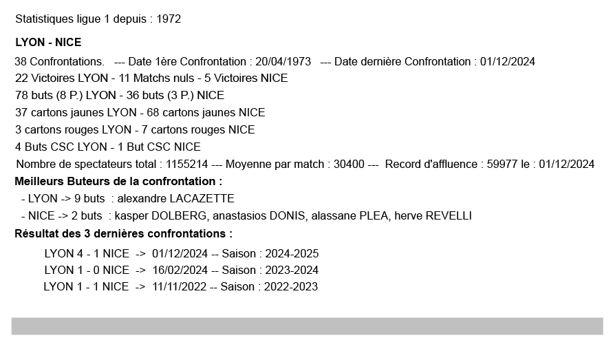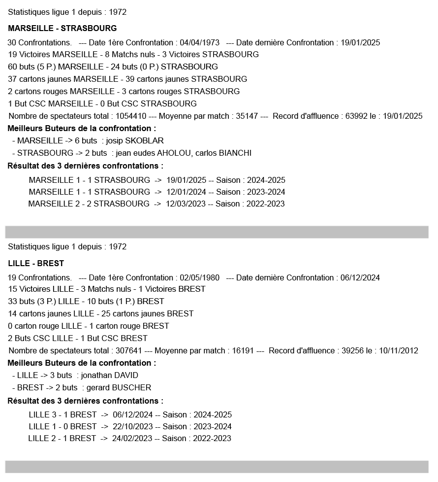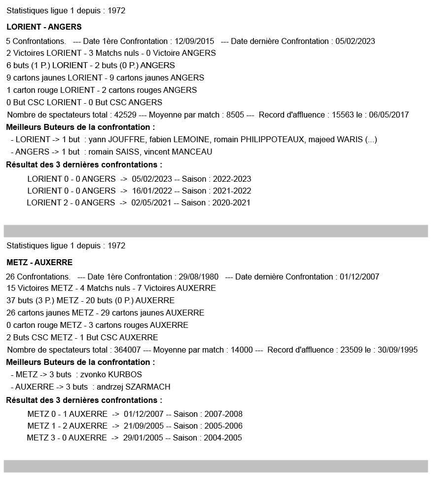 Les statistiques sont à considérer sur l’affiche (exemple pour Rennes – Paris SG : toutes les confrontations à Metz en Ligue 1 depuis 1972).
