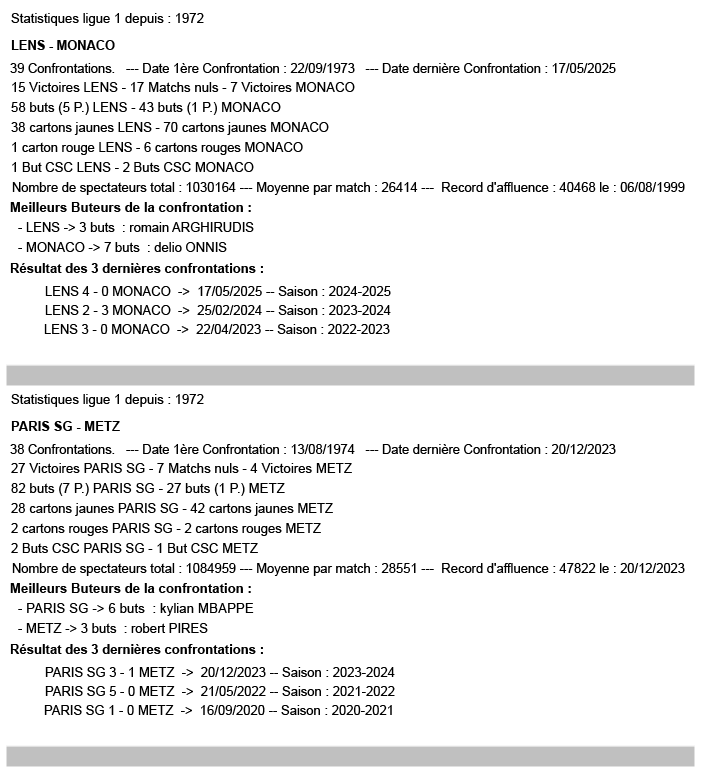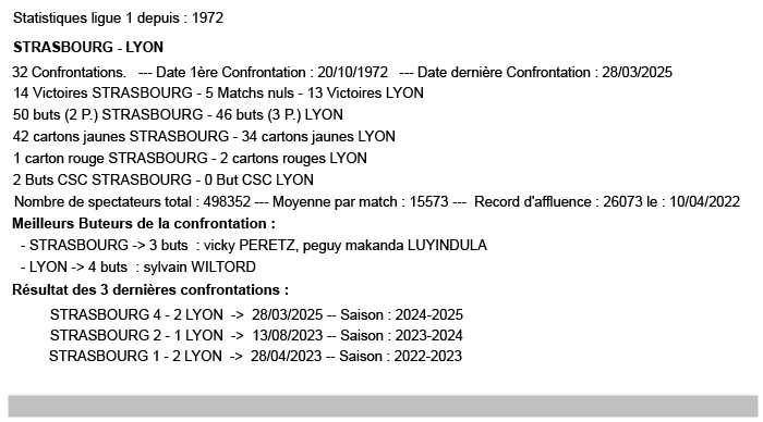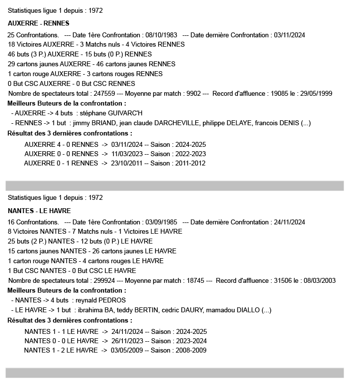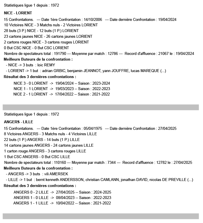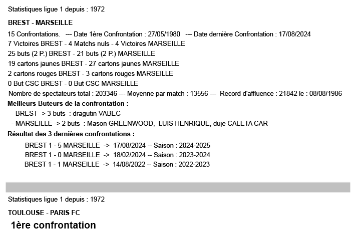 Les statistiques sont à considérer sur l’affiche (exemple pour Brest – Marseille : toutes les confrontations à Marseille en Ligue 1 depuis 1972).
