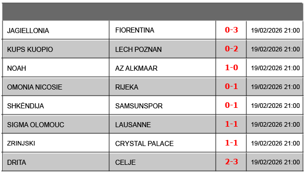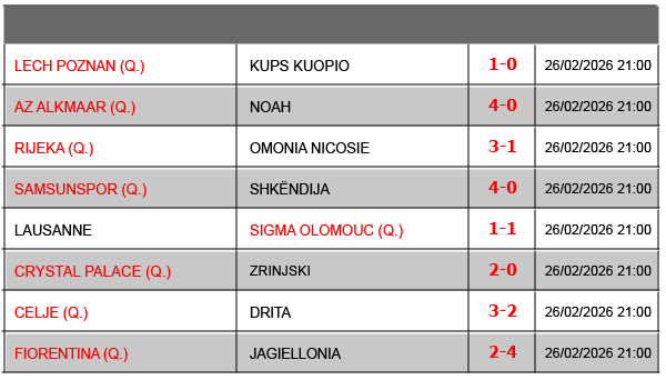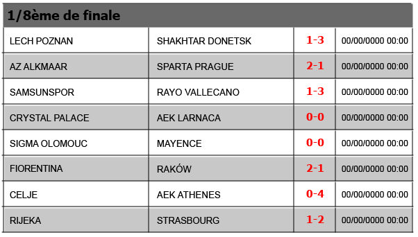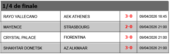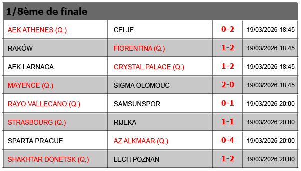 Résultats Ligue Conférence – 2025-2026 J1J2J3J4J5J6J7J81/16 aller1/16 retour1/8 aller1/8 retour1/4 aller1/4 retour1/2 aller1/2 retour