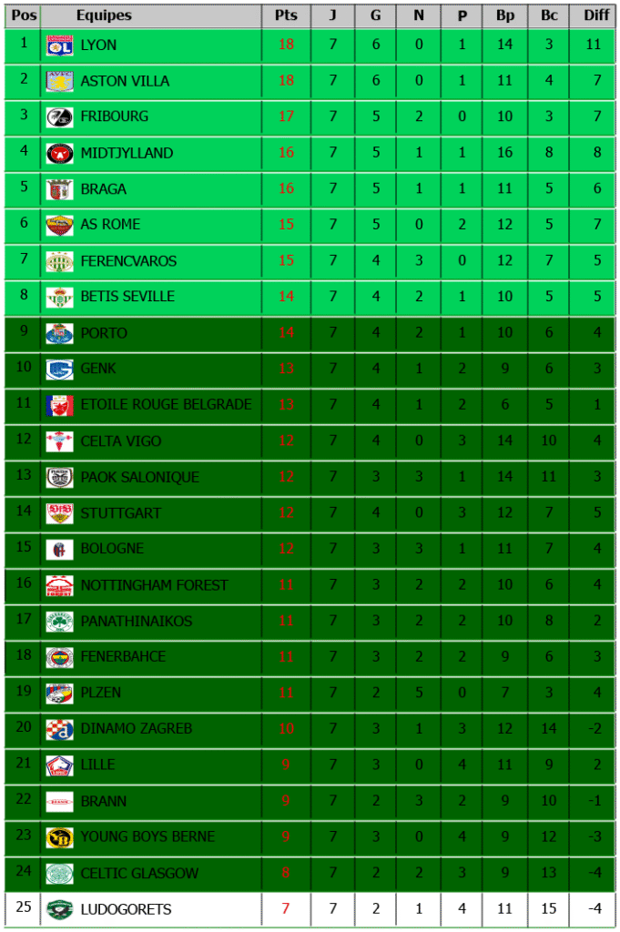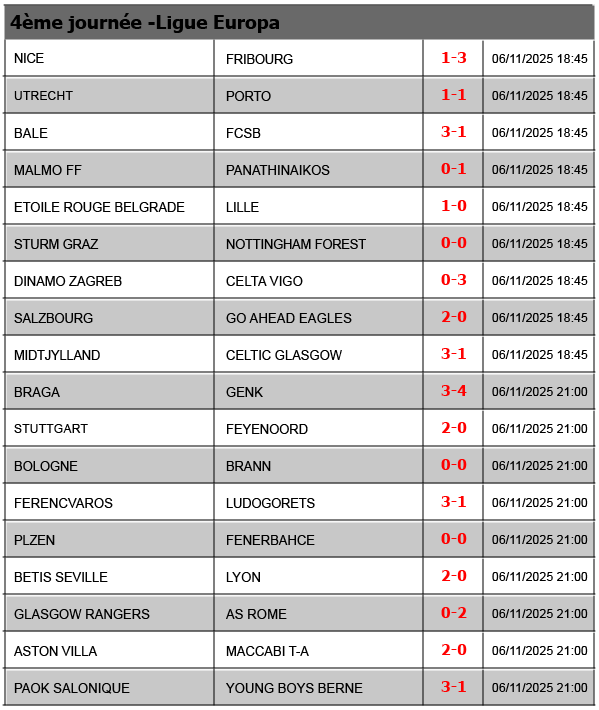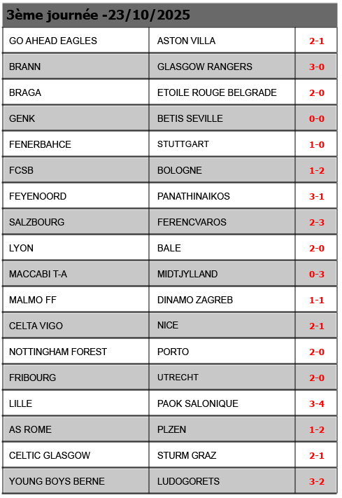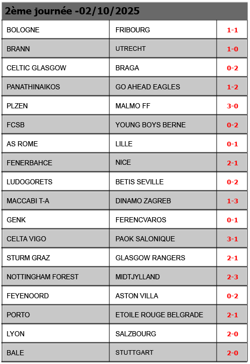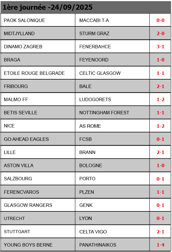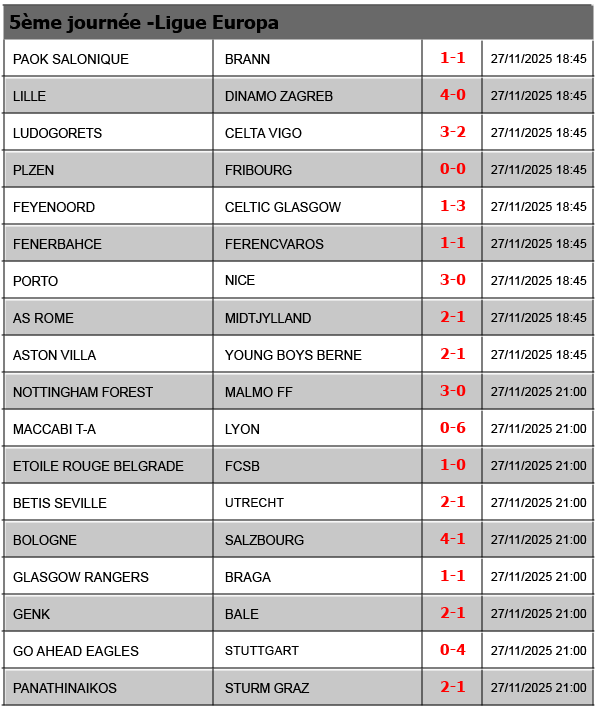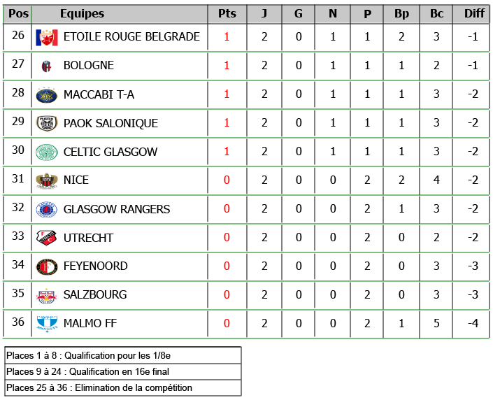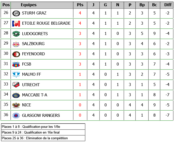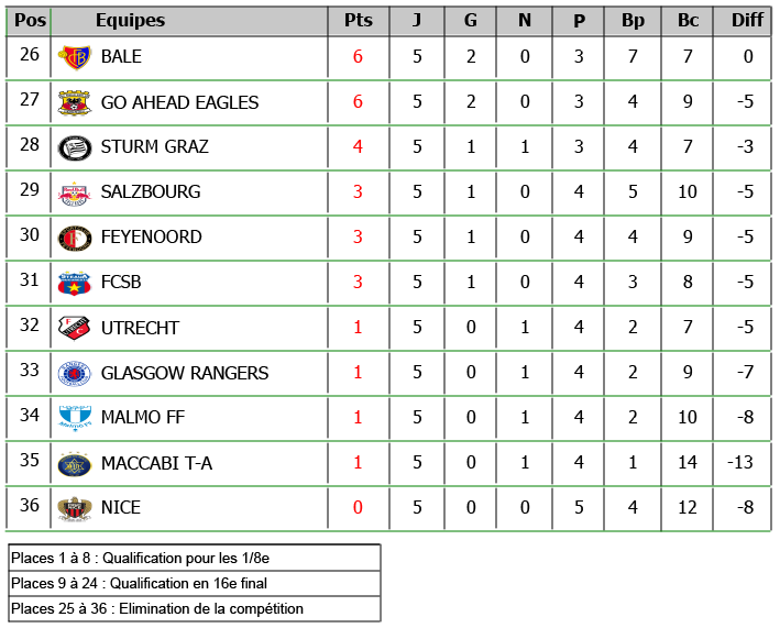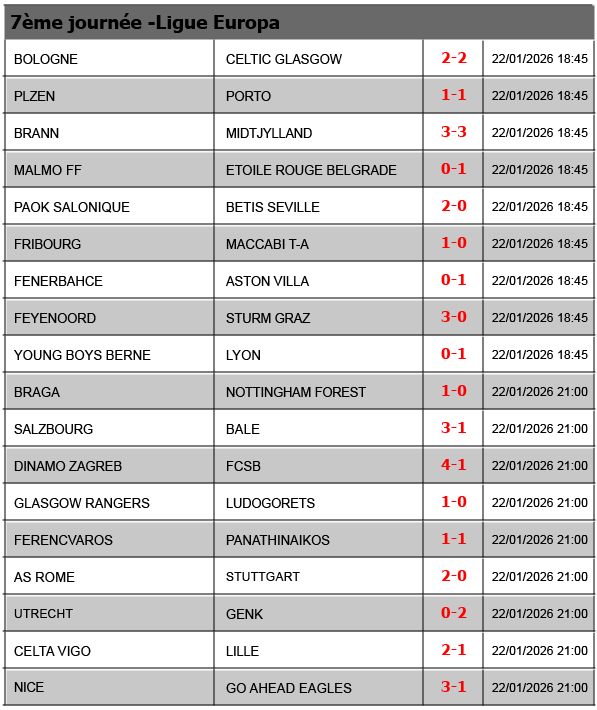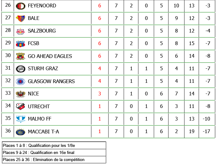 Résultat Ligue Europa – 2025-2026 J1J2J3J4J5J6J7J81/16 aller1/16 retour1/8 aller1/8 retour1/4 aller1/4 retour1/2 aller1/2 retour